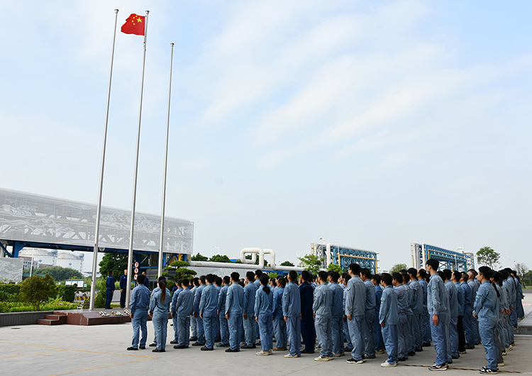在揭阳新材料基地项目部同步进行的升国旗仪式上,党委副书记、董事、纪委书记兼揭阳公司董事长唐泉涌强调,当前正值醋酸项目建设的攻坚时期,全体员工要以“时不我待”的紧迫感、“舍我其谁”的责任感、“功成有我”的使命感,发扬“有条件要上,没有条件创造条件也要上”的铁人精神,聚焦关键节点任务,严格把好安全关、进度关、质量关,全力冲刺2024年底项目中交的目标。
