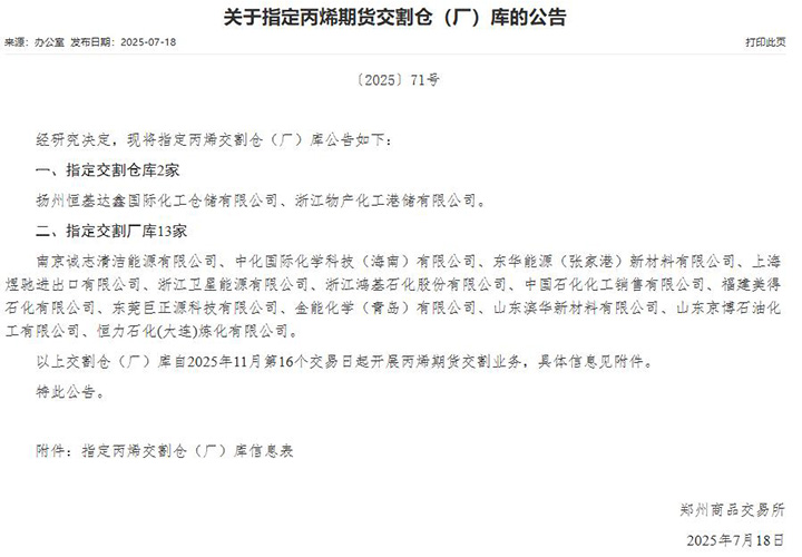 7月18日,东莞巨正源科技有限公司继成为大连商品交易所(以下简称“大商所”)聚丙烯期货指定厂库后,凭借在化工领域的专业实力与产业协同,成功通过郑州商品交易所(以下简称“郑商所”)的严格评审,正式成为郑商所丙烯期货指定厂库。